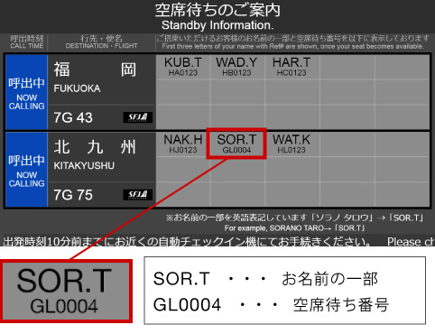 お名前の一部と空席待ち番号が表示されても、空席待ちチェックインをされないとご搭乗いただけません。