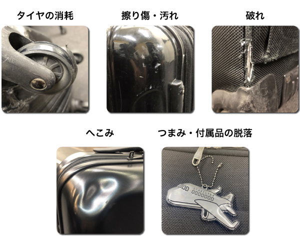 - 手荷物の過重、過容量による破損、経年劣化による取っ手の破損・タイヤの摩耗なども免責とさせていただきますのであらかじめご了承ください。