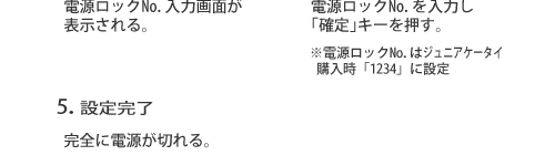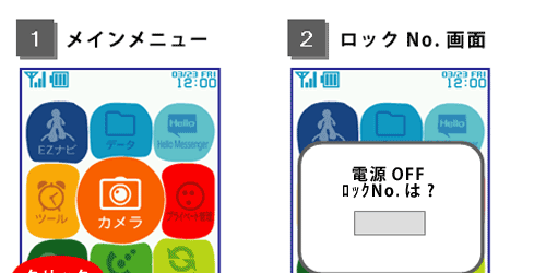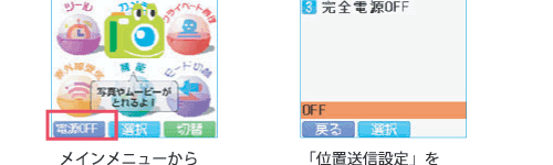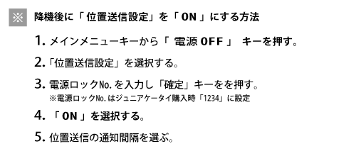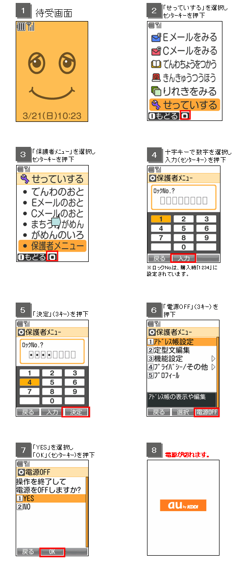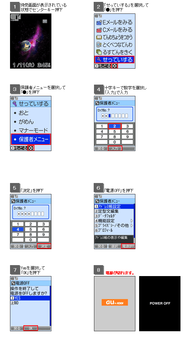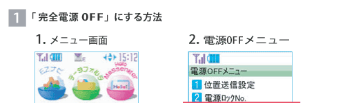 The au Junior Keitai mamorino is designed so that power can only be turned off from the parent menu, to prevent misuse and prevent any third party who does not know the parent menu lock No. from turning the power off. For in-flight safety reasons, use of electric (electronic) devices is prohibited. In-flight use of cell phones that emit radio waves is prohibited at all times. Passengers are requested to turn off cell phones before boarding by following the Operating Instructions below.
