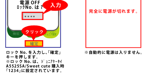 au Junior Keitai A5525SA and Sweets cute models may periodically turn on and transmit data automatically even while the cell phone itself is turned off if Notify Travel Route (Launch at Power OFF) is turned on in Settings. For in-flight safety reasons, use of electric (electronic) devices is prohibited. In-flight use of cell phones that emit radio waves is prohibited at all times. Passengers are requested to completely turn off cell phones before boarding by following the Operating Instructions below.