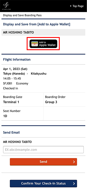Customers can register the Pass (2D barcodes) to Wallet (Passbook) on their iPhone from "Display and save Boarding Pass" after completing Online Check-In.