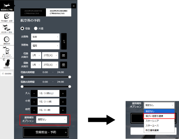 Under ‘Options for Each Fare Type’, select the discounted fare for passengers with disabilities, and then check the availability.