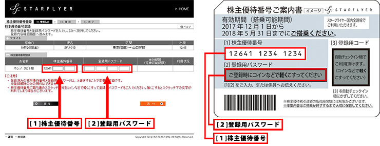 It is possible to reserve and purchase a ticket even if you don’t have your “Shareholder’s Benefit Number Guide” in your possession. (This excludes purchases made at the Star Flyer check-in counter and travel agencies.) Once you receive it, please register your shareholder’s benefit number and your registration password.