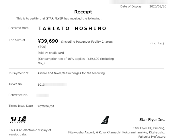 The Online Receipt Service is a service that allows receipt to be displayed on the PC website for tickets purchased on the Star Flyer official website, at the SFJ check-in counter, or via the SF Call Center (Japan domestic flight reservation and information center).