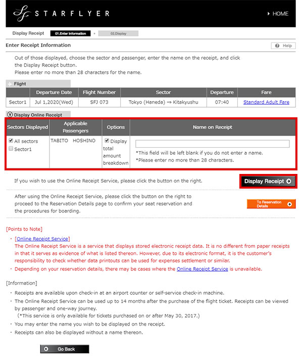 The receipt information input screen is displayed. Enter/select the following, and then tap on the ‘Display Receipt’ button.