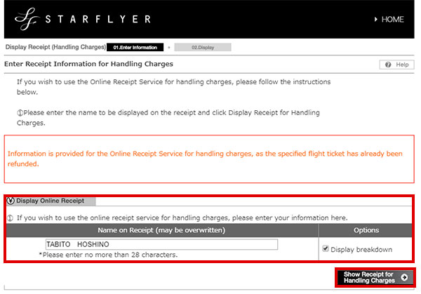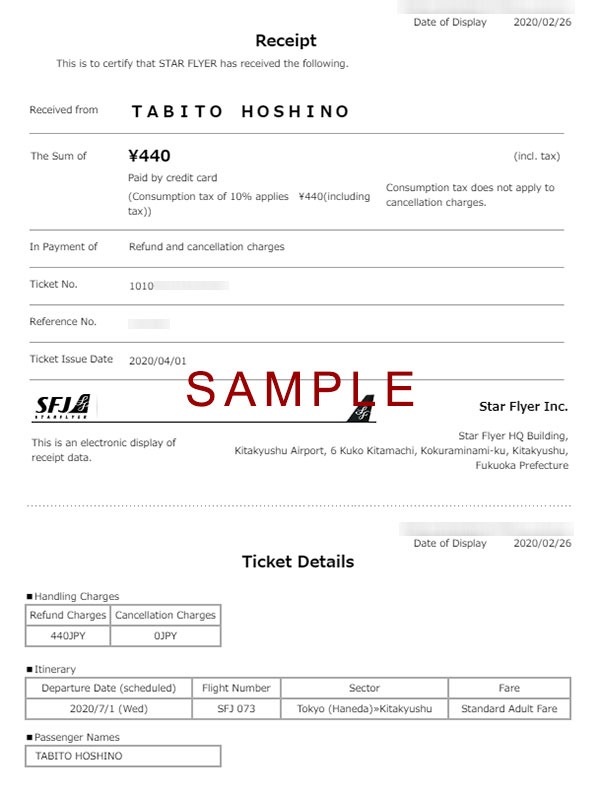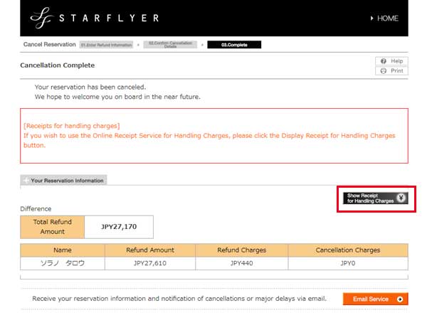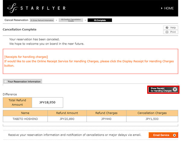 After you have cancelled your reservation, tap on the ‘Show Receipt for Handling Charge’ button, which is displayed at the top of the cancellation completion screen.
