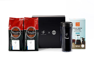タリーズがスターフライヤー機内ドリンク用に原料からこだわり仕上げたオリジナルブレンドのコーヒーと雑味が少なくすっきりとした味わいが特徴の水出しコーヒー、スターフライヤーオリジナルタンブラーをセットにしました。