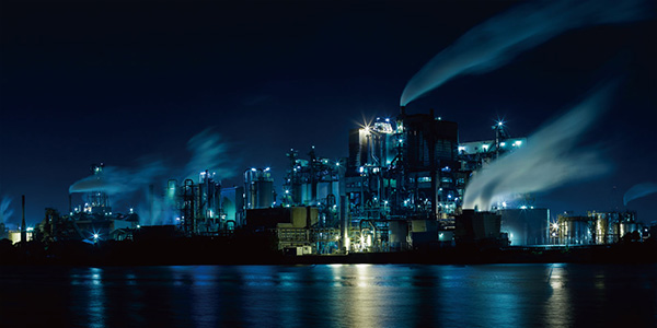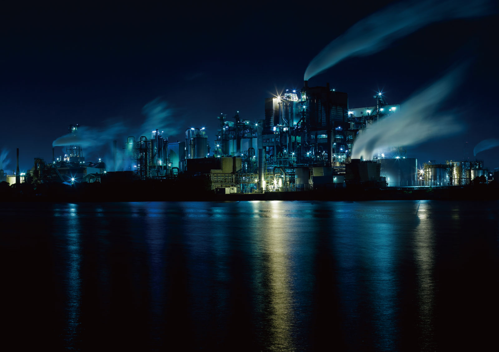 灯りに照らされるのは、群れをなす複雑な構造物の塊。闇の中に、むき出しの配管や巨大なタンクなどが妖しく浮かび上がる光景は、SF映画にでてくる無機質な未来都市、はたまた要塞のよう。これが意図的にデザインされたものではなく、あくまで機能を追求して作られた結果としての“構造美”なのだから、スケールの大きさも含め、圧巻としか言いようがない。