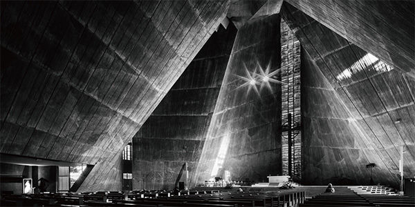 外観に心を揺さぶられたまま教会の中に足を踏み入れると、今度はコンクリート打ち放しの壁で造られた、静謐な巨大空間に驚かされる。「現代のコンクリート技術を最大限に駆使して、一つの崇高な精神的小宇宙を作りたい」という丹下氏の想いを形にした空間は、祈りを捧げることだけに集中できるシンプルな造り。余計な装飾がないからこそ、荘厳さが一層際立ち、神への畏怖を感じさせる雰囲気に満ちている。