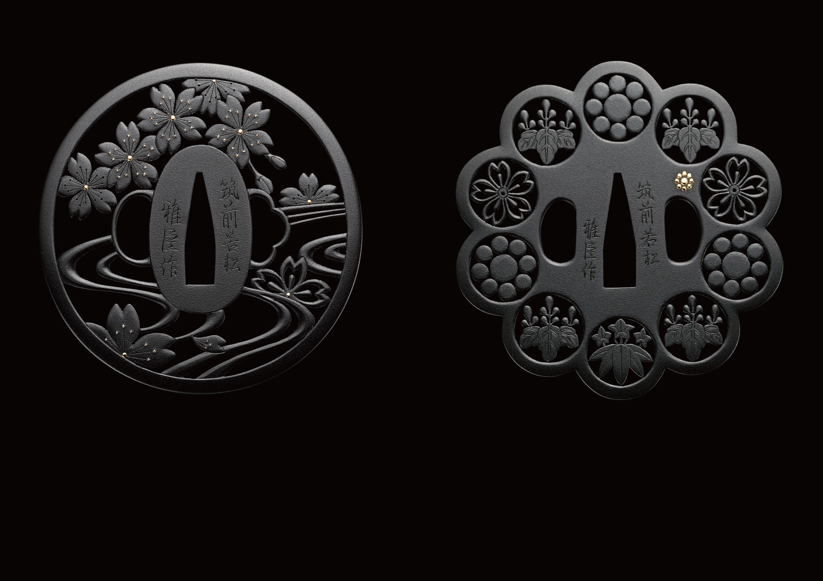 写真は、美しい鉄肌に緻密な文様が浮かび上がる「家紋透し鐸」(右)と、平成19年に日本一に輝いた「吉野川透し鐸」。通常は「家紋透し」のように伝統意匠を写した図柄が多い中、長嶺さんは幼い頃から得意だった絵の才能を生かし、オリジナルの図柄を考案。これを「筑前透し」と名付け、川の流れで遠近法を取り入れるなど、独自の世界観を表現している。もちろん、こうした表現を可能にするのは100本以上のヤスリを使い分け、髪の毛よりも細い線や穴に金をはめ込む象嵌、透かした文様に丸みを持たせる肉置きなど、卓越した技術が不可欠。到底、おもちゃの刀にはそぐわない一級品なのだ。