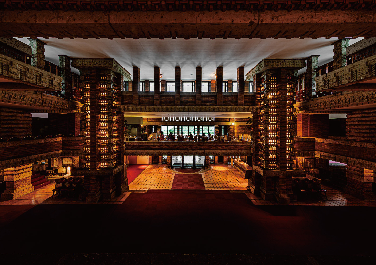 移築されたのはほんの一部だが、その迫力はご覧の通り。3階まである吹き抜けの大空間には、計算し尽くされた光が柔らかく降り注ぎ、特に愛知県常滑で焼かれたテラコッタと、栃木県の大谷石で作った「光の籠柱」は息を吞む美しさ。建物内外の、至るところに幾何学的な模様の彫刻を施すなど、一切の妥協を許さず、細部まで贅を尽くした空間に立てば、かつて海外から多くの賓客を受け入れ、隆盛を誇っていた当時の空気感までもが伝わってくるようだ。