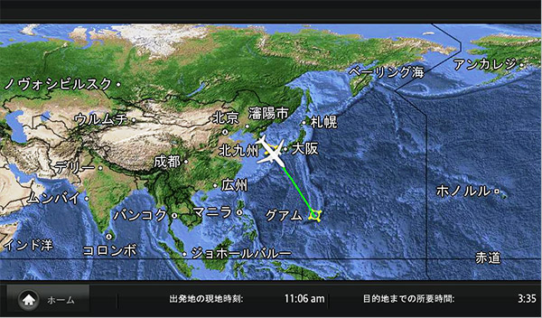 現在の位置情報を地図で確認するのも、機内での楽しみのひとつ。最新の到着予定時刻も確認できます。