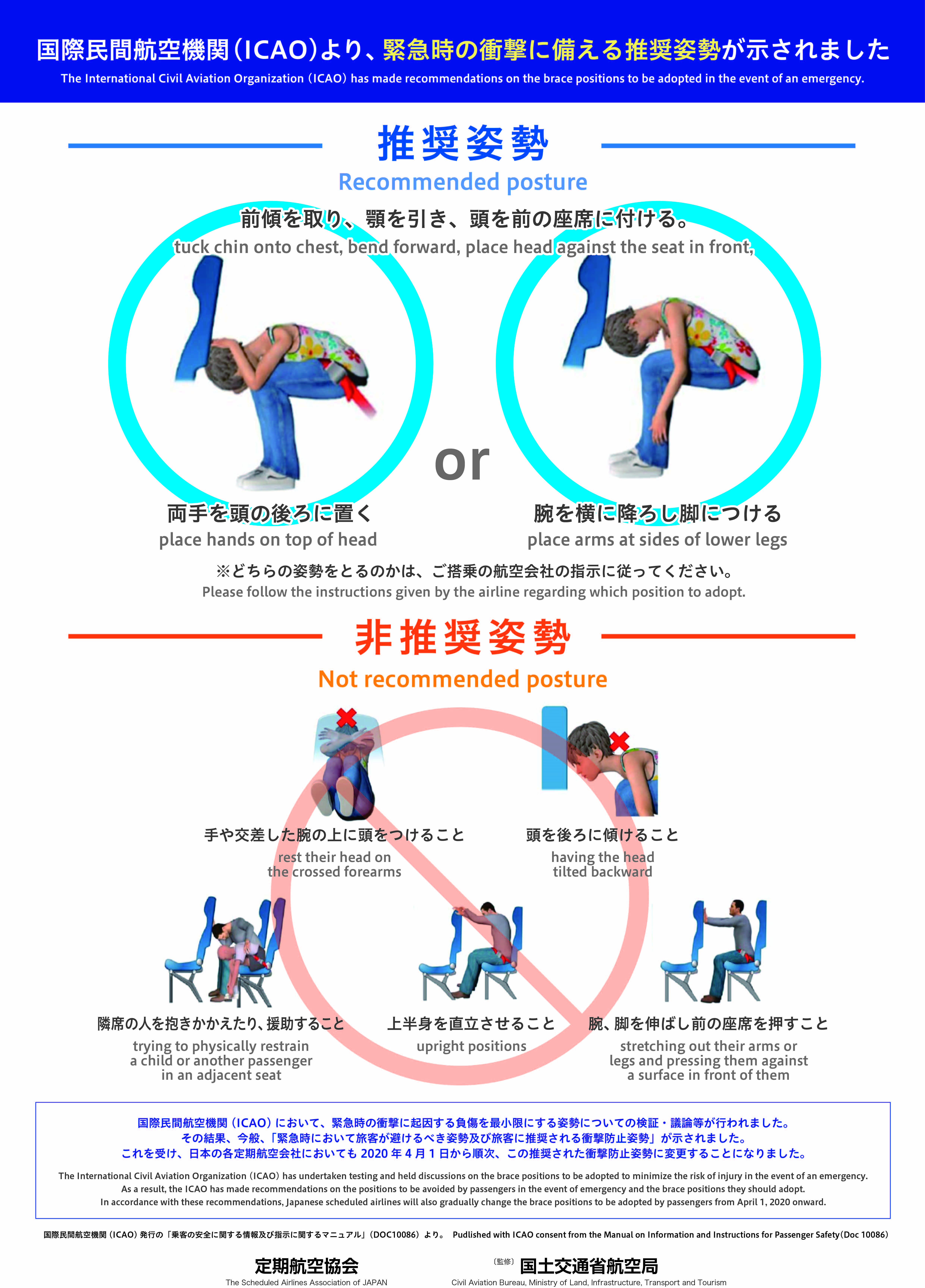 The Scheduled Airlines Association of Japan has created a poster for air passengers that details the brace positions recommended by the ICAO.
