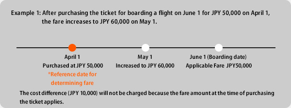 April 1 (reference date for determining fare): Ticket cost = JPY 50,000, May 1: Ticket cost increased to JPY 60,000, June 1 (Boarding date): Fare amount JPY 50,000
