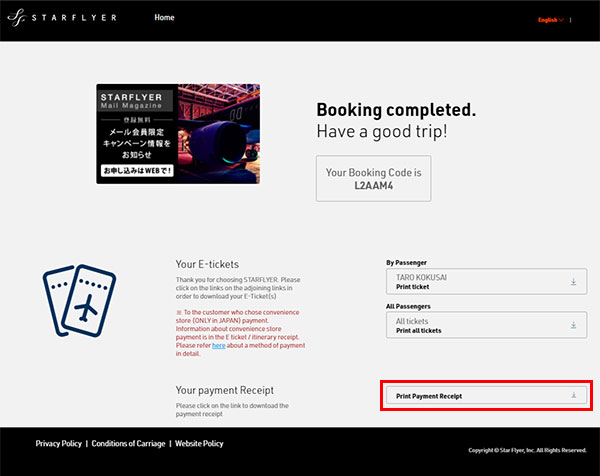 When the payment has been made, the following screen will be displayed. Click the ‘Print Receipt’ button, which is displayed in the lower right corner.