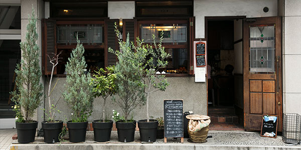 通勤中のバイクが行きかう車道からも見渡せるほどの大きくひらかれた店先、歩道に面したオープンキッチンが印象的だ。