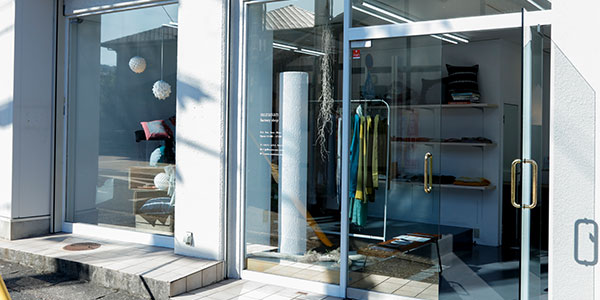 大きなガラス窓から目に映るのは、従来の浴衣や手ぬぐいの有松絞ではなく、色鮮やかな黄色や青に染められたカシミヤニットやストールなどの洋服たちだ。