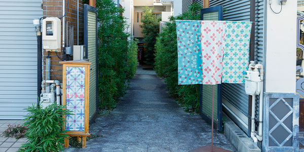 水色やピンクの色彩鮮やかな手ぬぐいがかかる入口と緑深い笹のアプローチが奥に続く道に目がとまった。