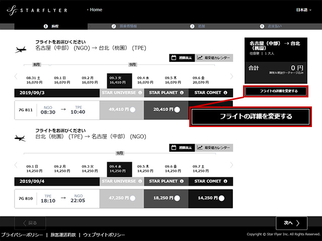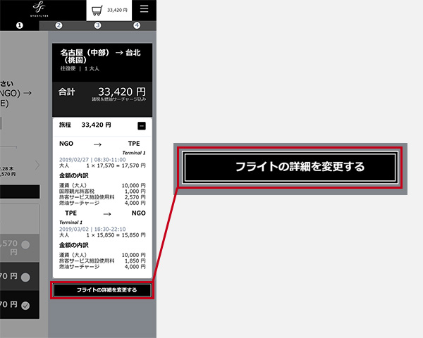 空席照会ページ右の運賃合計ボックス下にある、フライトの詳細を変更するボタンをクリックします。