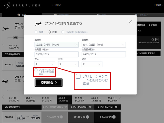 割引の適用は対象搭乗期間内のSTAR COMET運賃に限ります。お日にちおよび運賃をお間違いございませんようご注意ください。