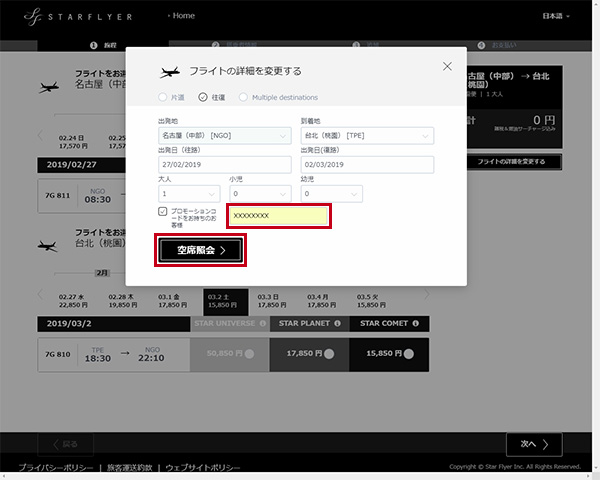 プロモーションコードの入力欄が開きますのでクーポンコード(プロモーションコード)を入力し、空席照会ボタンを押下します。