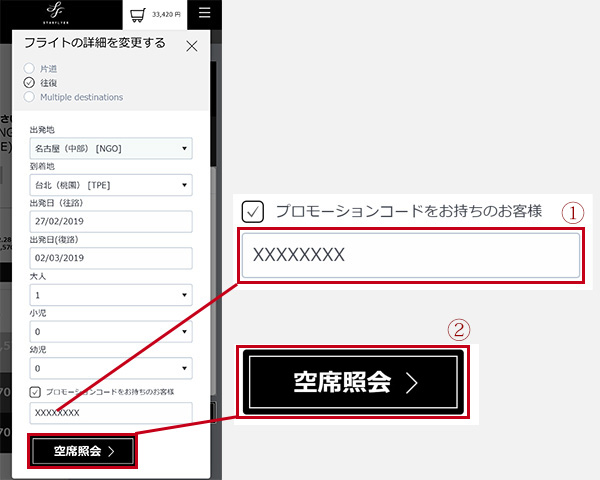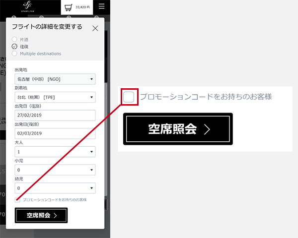 プロモーションコードの入力欄が開きますので、クーポンコード(プロモーションコード)を入力し、空席照会ボタンをタップします。