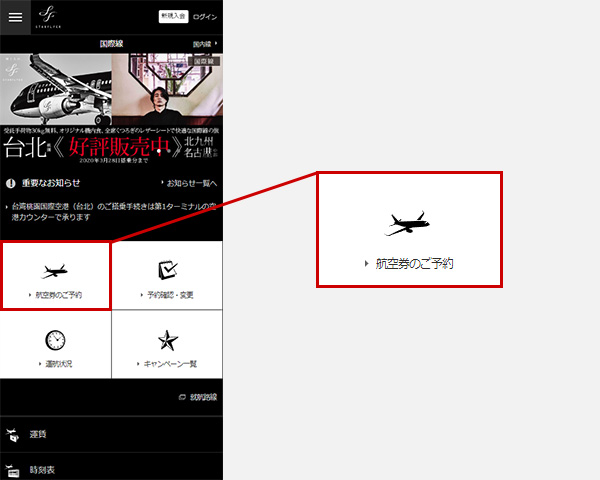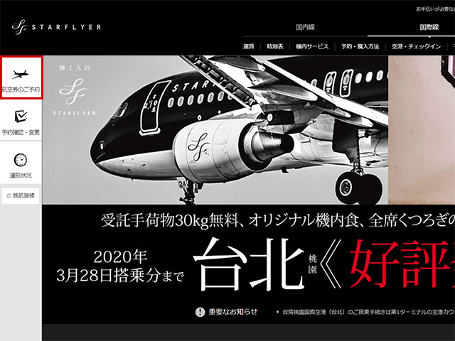 国際線ホームページ左側の「航空券のご予約」をクリックします。