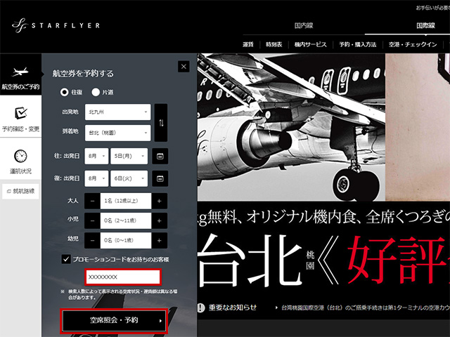 プロモーションコードの入力欄が開きますのでコードを入力し、空席照会ボタンを押下します。