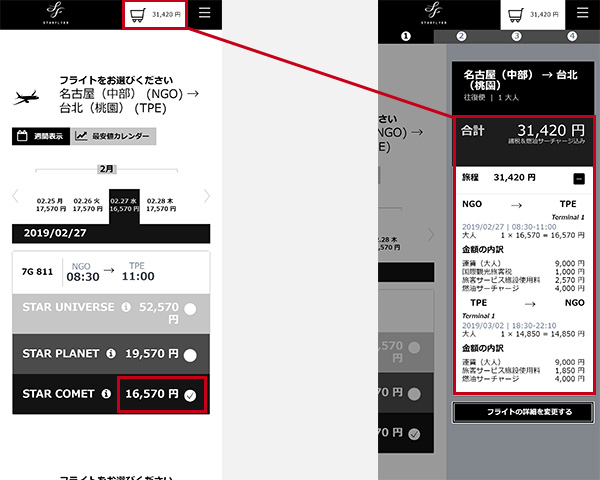 表示された空席照会結果画面に、割引の適用された運賃が表示されます。ご希望便のSTAR COMET運賃をご選択のうえご予約ください。