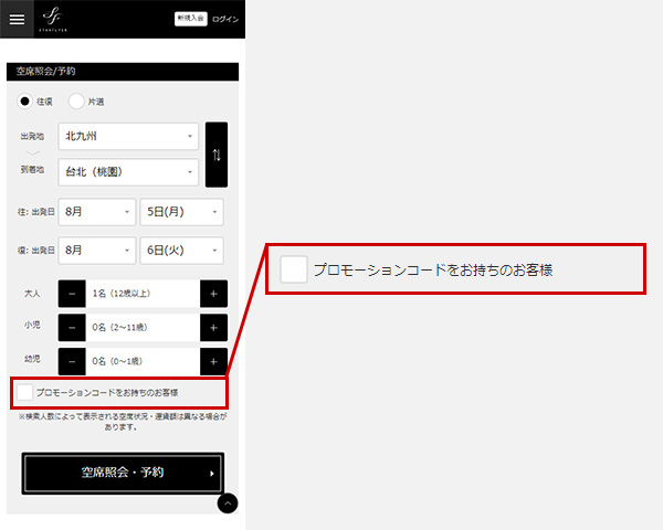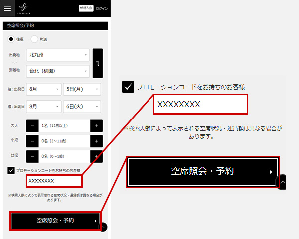 プロモーションコードの入力欄が開きますので、コードを入力し、空席照会ボタンをタップします。