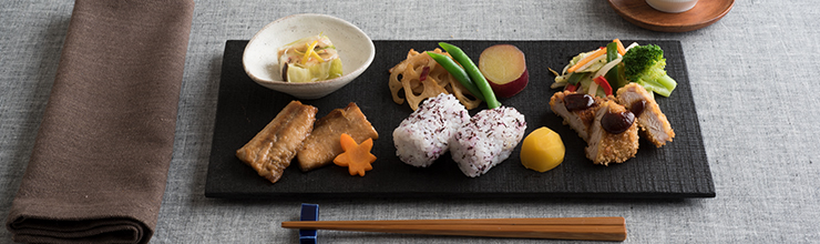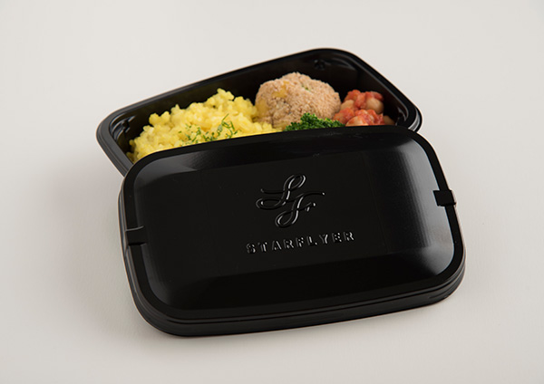 機内食の盛りつけに用いるのは、スターフライヤーのイメージカラーである「黒」を取り入れたお弁当箱風のパッケージ。上蓋の中央にロゴマークが刻印された、こだわりのオリジナル容器です。蓋を開けた瞬間から、お楽しみが広がります。