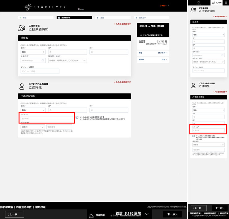 予約時に表示される「②搭乗者情報」入力画面にて、必要事項をご入力ください。