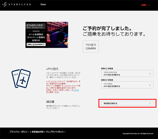 支払いを完了すると下記画面のページが表示されます。右下に「領収書を印刷する」ボタンが表示されますので、こちらを押してください。