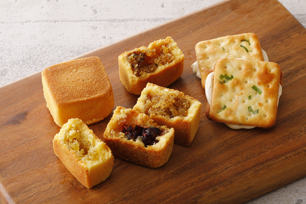 サクサクと歯ざわりの良いクッキーは、紅茶や台湾茶と一緒に楽しみたくなる素朴な味わい。ヌガーサンドは、塩味の効いたクラッカーにヌガーを薄くサンドし、表面に葱(ねぎ)を散りばめた、台湾では定番のお菓子です。