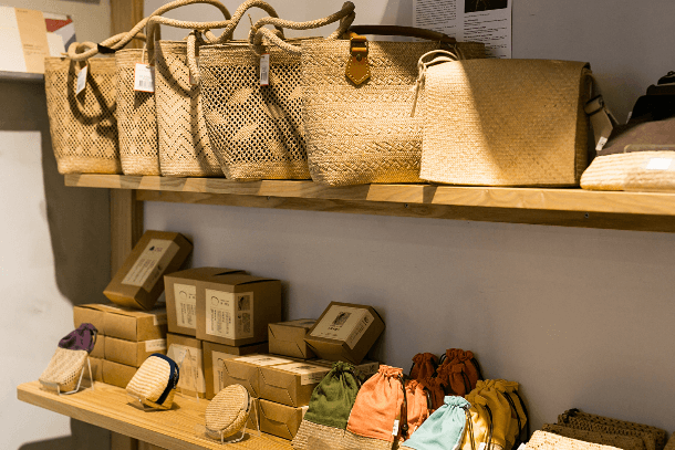 「地元に伝わる藺草編みの伝統技術を守りながら、職人のおばあちゃんたちが丁寧に創っています。こちらのブランドは、若い人がデザインに関わって上手に今どき感をプラスさせているんですよ」と游さん。