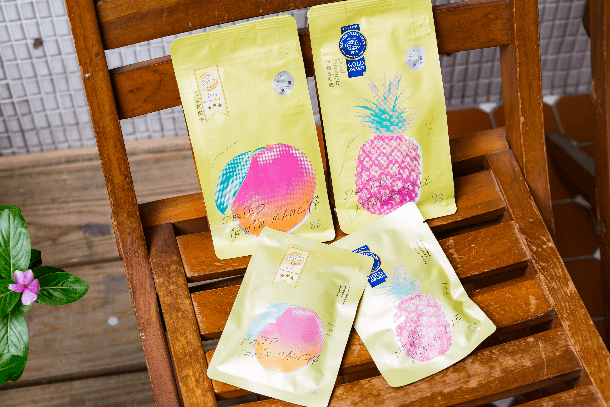 明るい手描きイラストのパッケージは「陽光菓菓-SunnyGoGo」のドライフルーツ(10種類135元〜)。