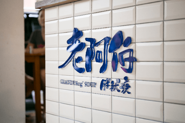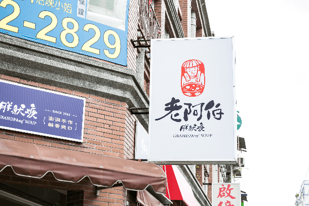 通りから見える「おじいちゃんのとろみイカスープ」という意味の屋号と、かわいいイラストが載っている看板が目印です。