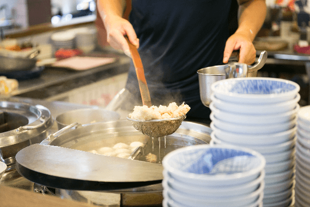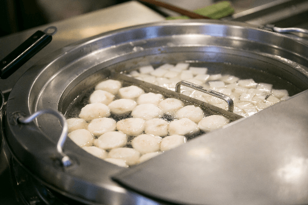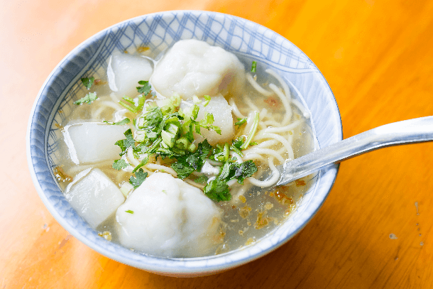 スルメイカのすり身は、弾力と歯ごたえがあって風味豊か。魚のつみれの中には甘じょっぱい肉餡が詰まっていてボリューム満点です。それらの具材を引き立てるスルメイカベースのスープは毎朝仕込むため、臭みもなくあっさり。ちなみにほんのり甘みを感じる澄んだスープの秘訣は、鍋で一緒に煮込む大根にあるのだとか。