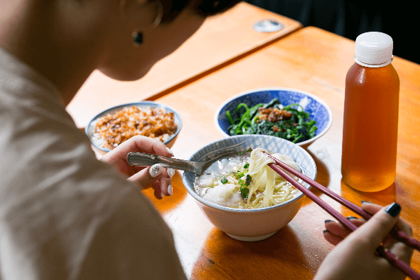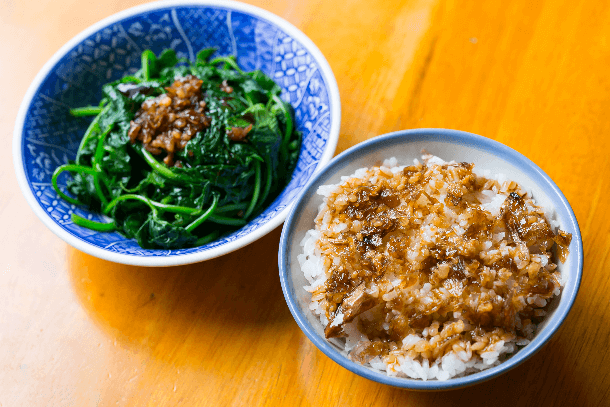 麺メニューに加えて、揚げたネギとニンニクの甘辛ダレをかけたご飯「油蔥飯」(小30元〜)をセットにするのがローカル流。ひと口食べると、揚げネギのガーリック風味と醤油の香ばしさが口の中に広がってテンションが上がります。