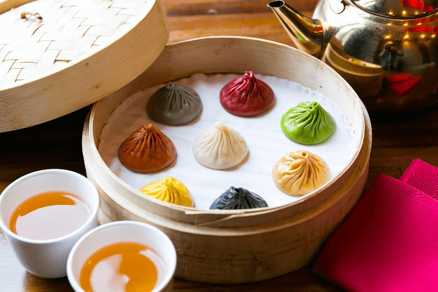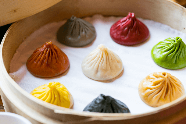 翡翠のような美しい緑色の小籠包は、高麗人参味。その手前のオレンジ色はフォアグラ味、次は黒トリュフ、チーズ、蟹の卵、ガーリック、香辛料の一種である麻辣(マーラー)。