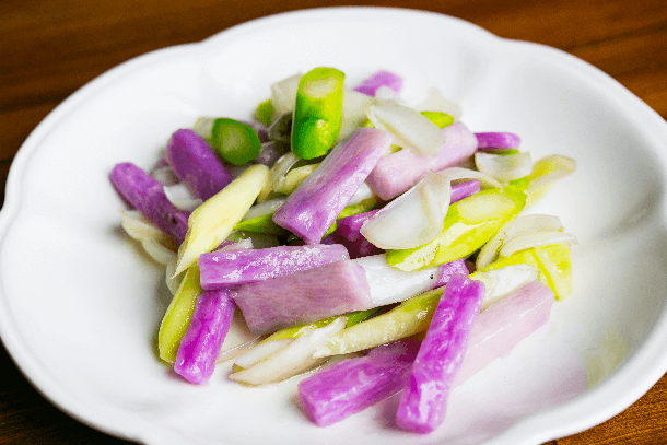 紫とグリーンのコントラストが美しい一品は、「長芋・ゆり根と野菜の炒め物(紫山藥百合炒時蔬)」。