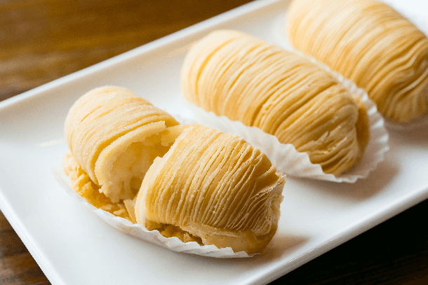ミリ単位で生地に切り目を入れる職人技は、目を見張るものが!皮はサクッとしたパイの食感と程よい塩味が感じられ、中からは大根の甘みがふんわり。