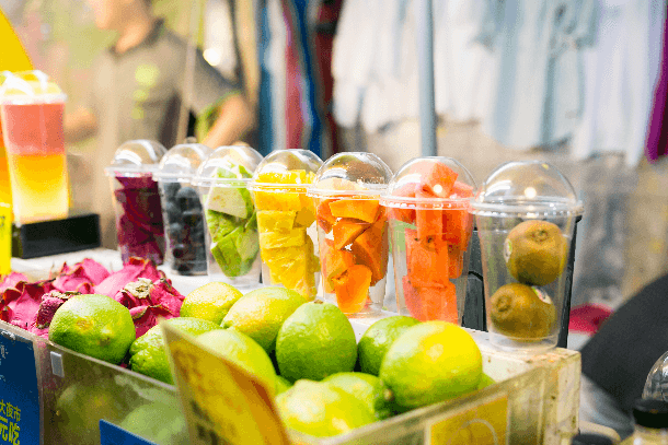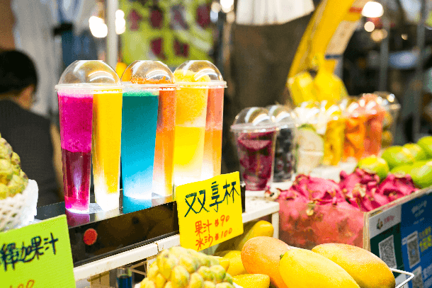 カラフルな色合いに心弾む果物ジュースの屋台は、フルーツが豊富な台湾らしい光景。マンゴー、パパイヤ、ドラゴンフルーツのほか、日本では珍しい釈迦頭(シュガーアップル)やレンブ(ワックスアップル)、ライチなど、旬のフルーツに出会えます。