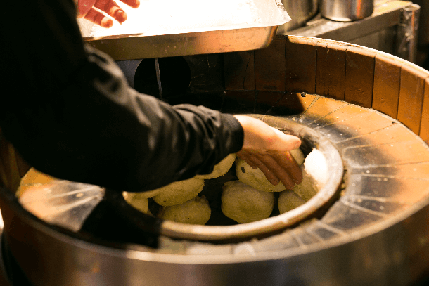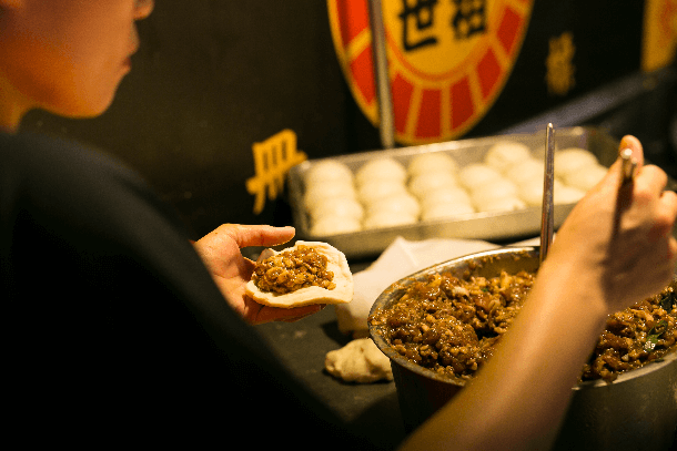 餡を包む手さばきに思わず釘付けになるのは、現地でも大人気の「福州世祖胡椒餅」の胡椒餅(50元〜)。窯の側面に生地を張りつけ、炭火で焼き上げていく様子がとてもユニークです。分厚い皮のなかには、胡椒を効かせた豚肉の餡とネギがたっぷり。饒河街観光夜市の名物ですので、ぜひお試しを。