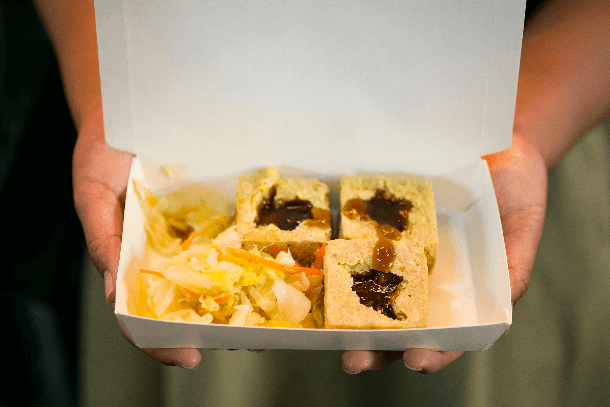 台湾ソウルフードの代表格「臭豆腐(しゅうどうふ)」もあります。臭豆腐とは、酪酸菌や納豆菌などを混ぜた液に、お豆腐を漬け込んだもの。