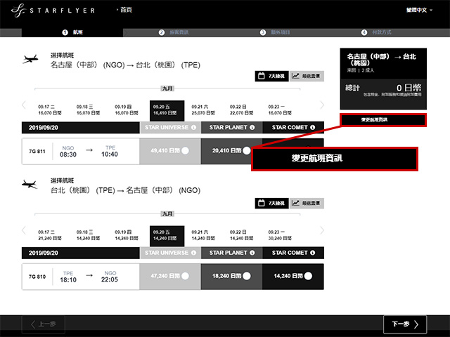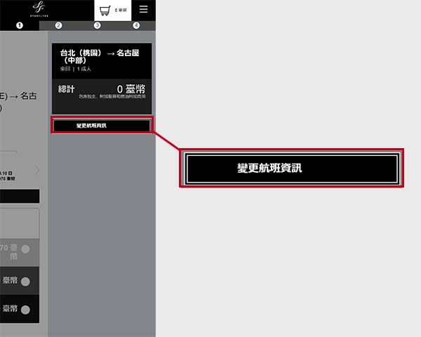 點擊查詢機位頁面右側的票價合計欄下方的變更航班資訊。