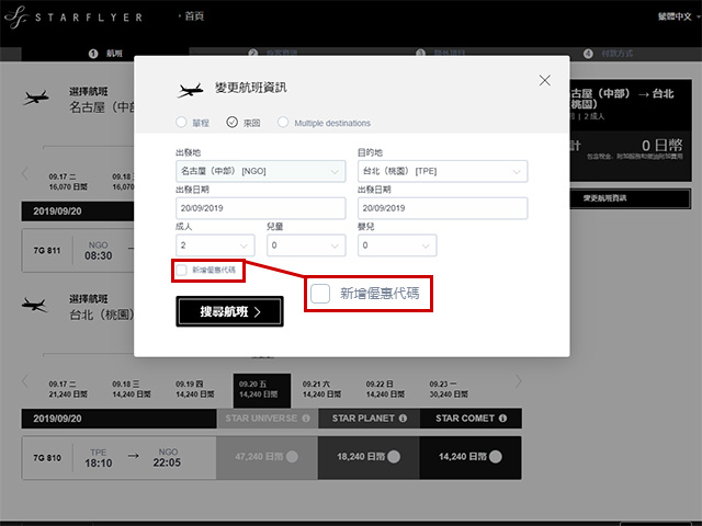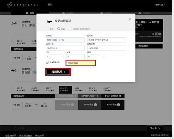顯示促銷代碼欄位後,輸入優惠券代碼(促銷代碼),點選搜尋航班按鈕。