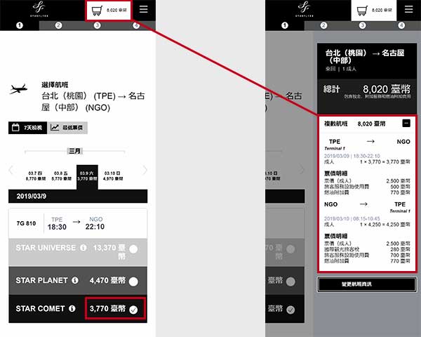 2位大人,去程班機搭乘STAR COMET / 回程班機搭乘STAR UNIVERSE ・・・ 合計折扣新台幣600元。