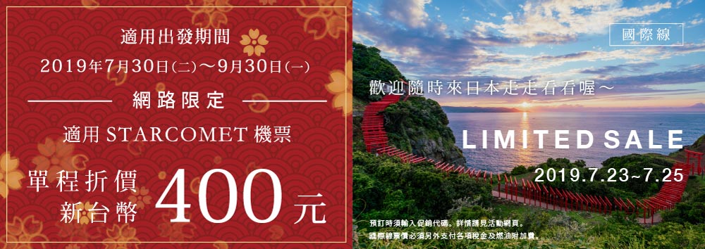 | 適用金額 | 適用於大人(12歲以上)STAR COMET票種,每個單程票價可折扣JPY1,500或者是TWD400。