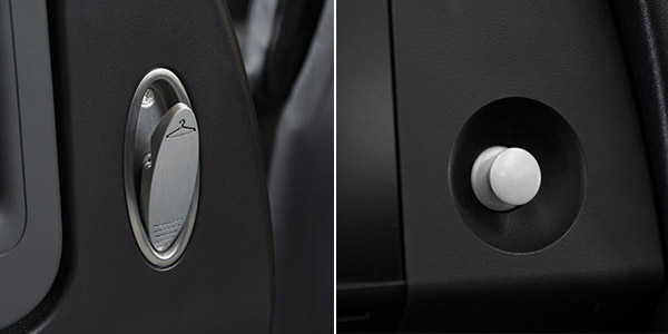 在座位前方的掛鉤可以掛置外套以及上衣。